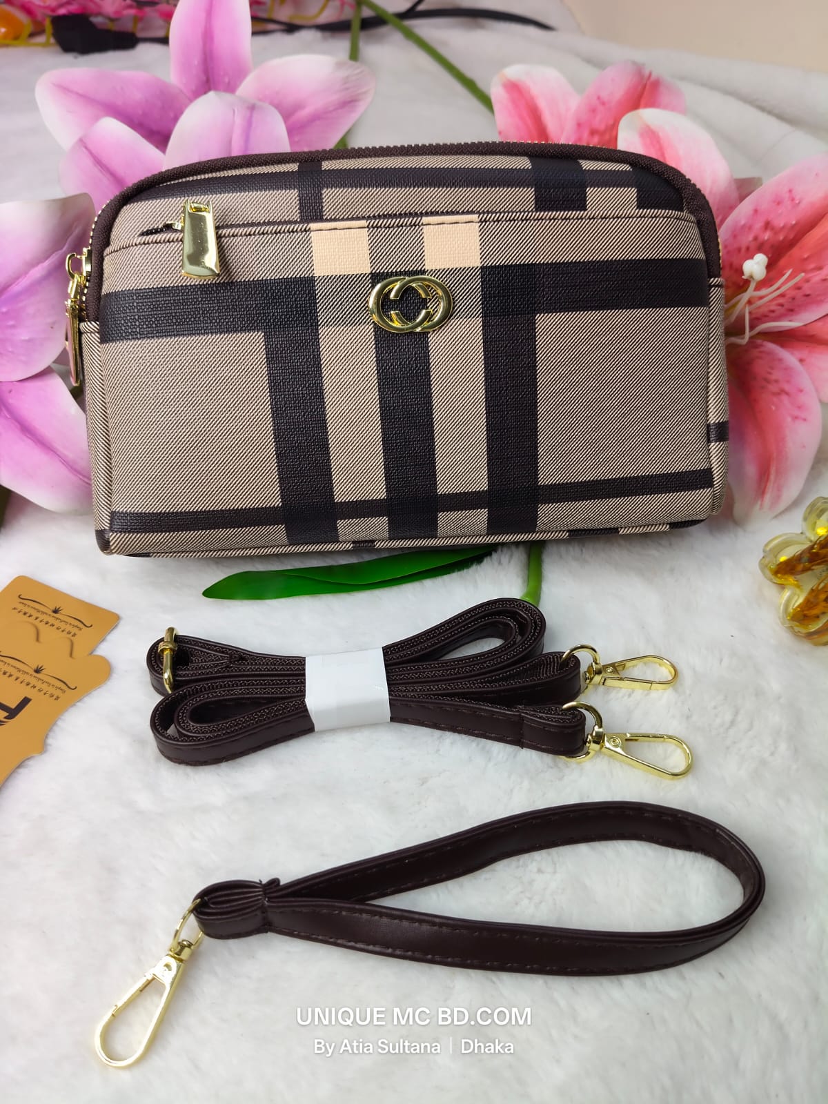 Classic Beige Check Multi-Functional Clutch Bag আপনার লুককে দেবে একটি এলিগেন্ট এবং ট্রেন্ডি ফিনিশ। ফ্যাশনেবল চেক ডিজাইন, গোল্ডেন মেটাল লোগো এবং ডার্ক-ব্রাউন স্ট্র্যাপ এটিকে যেকোনো আউটফিটের সাথে মানানসই করে তোলে। কম্প্যাক্ট হলেও এর ভিতরে রয়েছে ফোন, কার্ড, টাকা ও কসমেটিকস রাখার পর্যাপ্ত স্পেস।